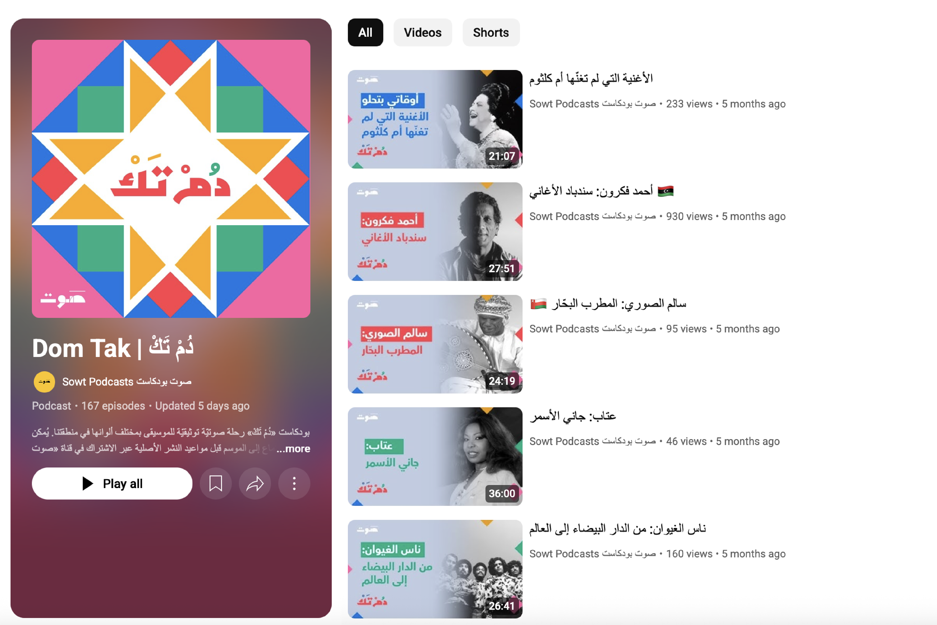 Overview: Music is one of the strongest vessels of culture and memory, and Dom Tak takes listeners on a sonic journey through the many genres, traditions, and evolutions of music across the Arab world. Produced under Sowt Podcast, the show serves as both a documentation and celebration of regional music, bringing forward stories that are as diverse as the rhythms themselves.